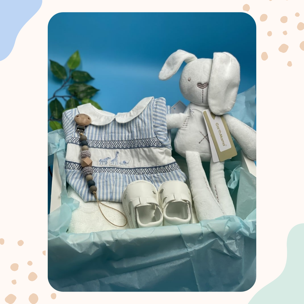 - بطانية فاخرة، تحتوي العبوة على بطانية مصنوعة باحترافية، توفر الحماية من البرودة، مع تطريز فاخر ومتانة استثنائية من الصوف، و تعتبر هذه البطانية من أبرز القطع في بوكسات الأولاد للمولود.